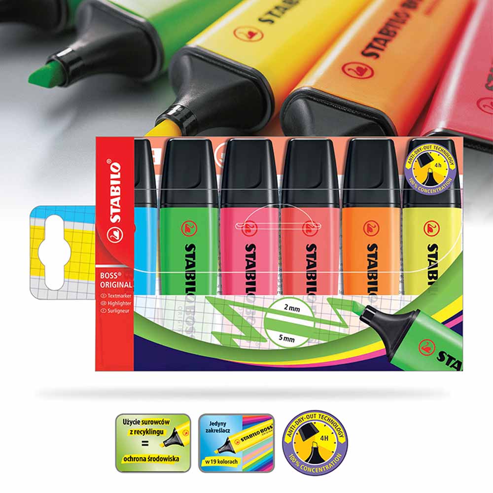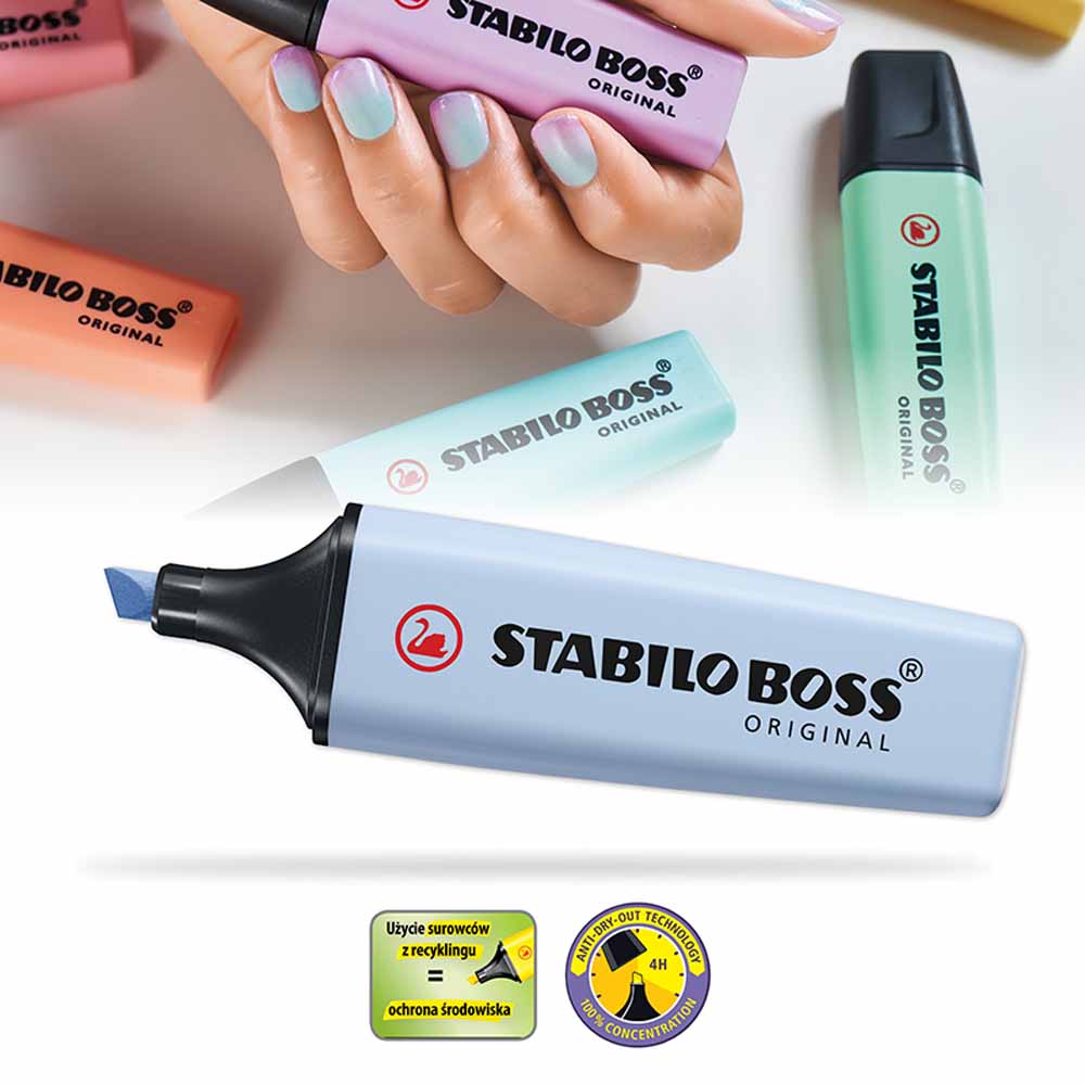 STABILO BOSS ORIGINAL dba o środowisko - wszystkie czarne elementy zakreślacza wykonane są z plastiku pochodzącego z recyklingu. Zakreślacz jest również łatwy do ponownego napełnienia, co redukuje ilość odpadów.