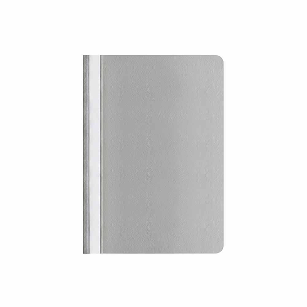 Skoroszyt wyposażony jest w wymienny, papierowy pasek do opisu, który ułatwia identyfikację zawartości. Dwa wycięcia umożliwiają szybkie i łatwe wysuwanie paska, co dodatkowo poprawia funkcjonalność. Zaokrąglone rogi obu okładek zwiększają komfort użytkowania i zapobiegają uszkodzeniom innych dokumentów.