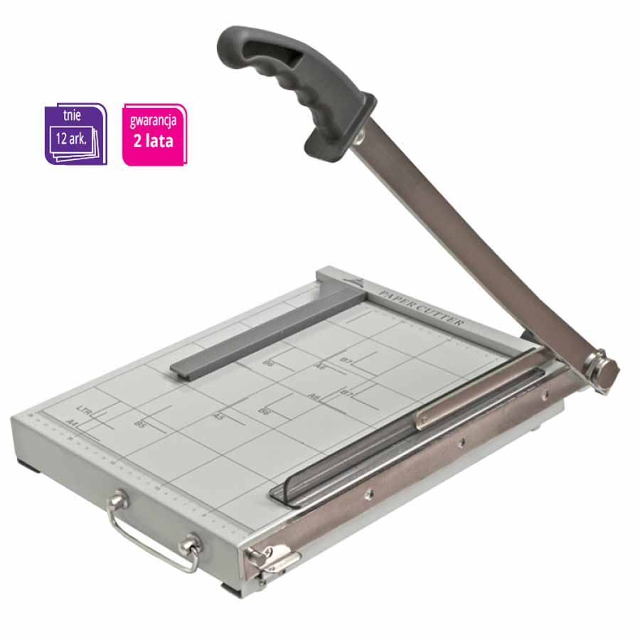 Urządzenie jest idealne do cięcia nie tylko papieru, ale także kartonu oraz cienkiej blachy. Dzięki standardowym szablonom formatów na blatach roboczych, ustawienie odpowiednich wymiarów jest szybkie i proste, co znacznie przyspiesza pracę. Gilotyna umożliwia jednorazowe cięcie do 12 kartek (70g), co czyni ją praktycznym narzędziem w codziennych zadaniach biurowych.