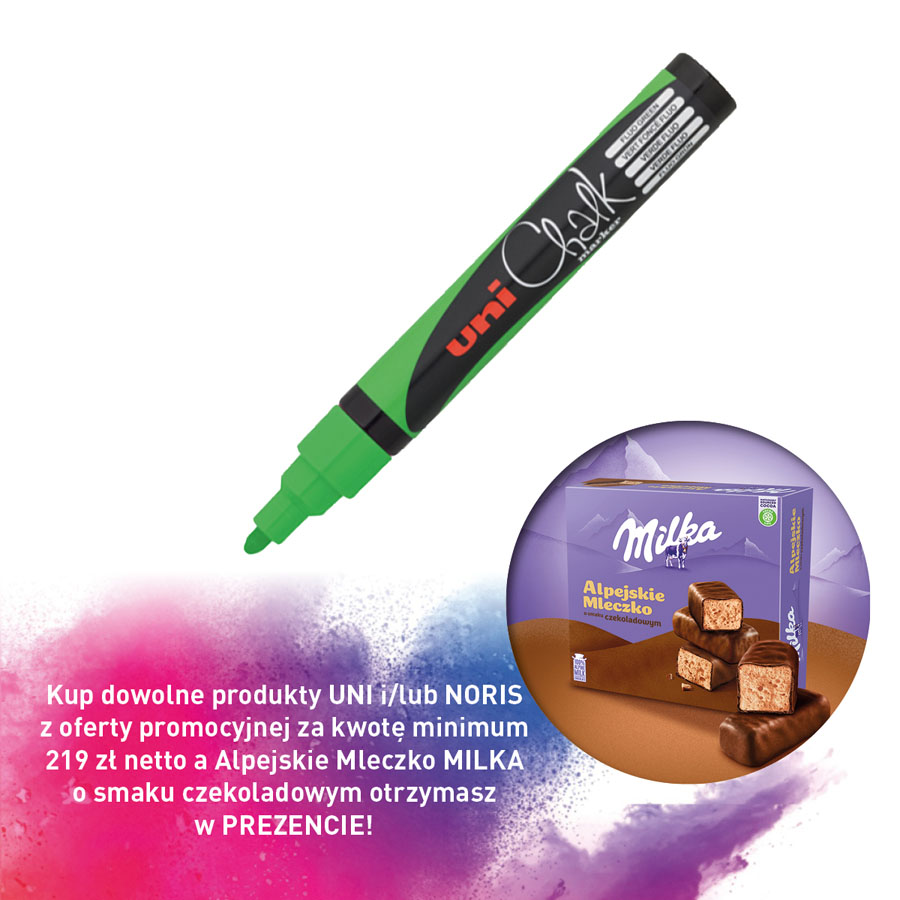 jm.: szt Kup dowolne produkty UNI i/lub NORIS z oferty promocyjnej za kwotę minimum 219 zł netto a Alpejskie Mleczko MILKA o smaku czekoladowym otrzymasz w PREZENCIE!