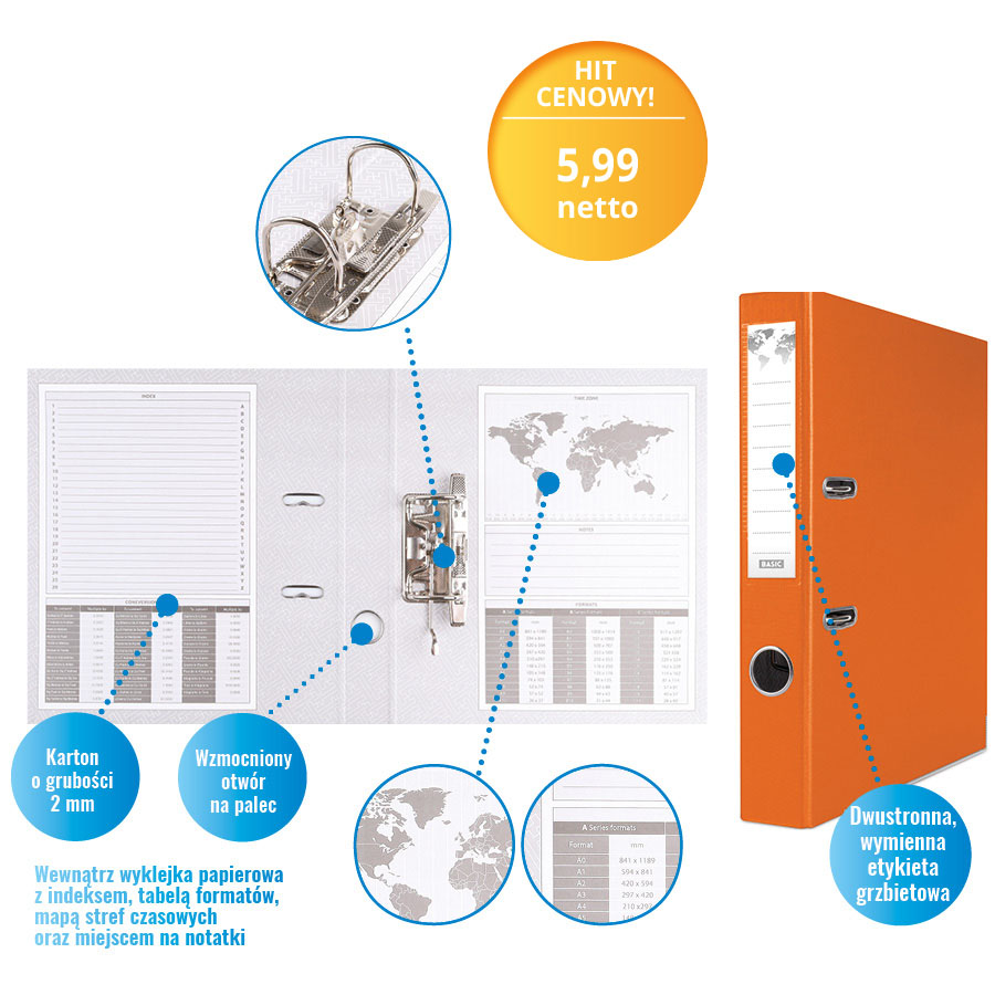 • z metalową blaszką skoroszytową oraz 4 dziurkami umożliwiającymi wpięcie wąsów do segregatora