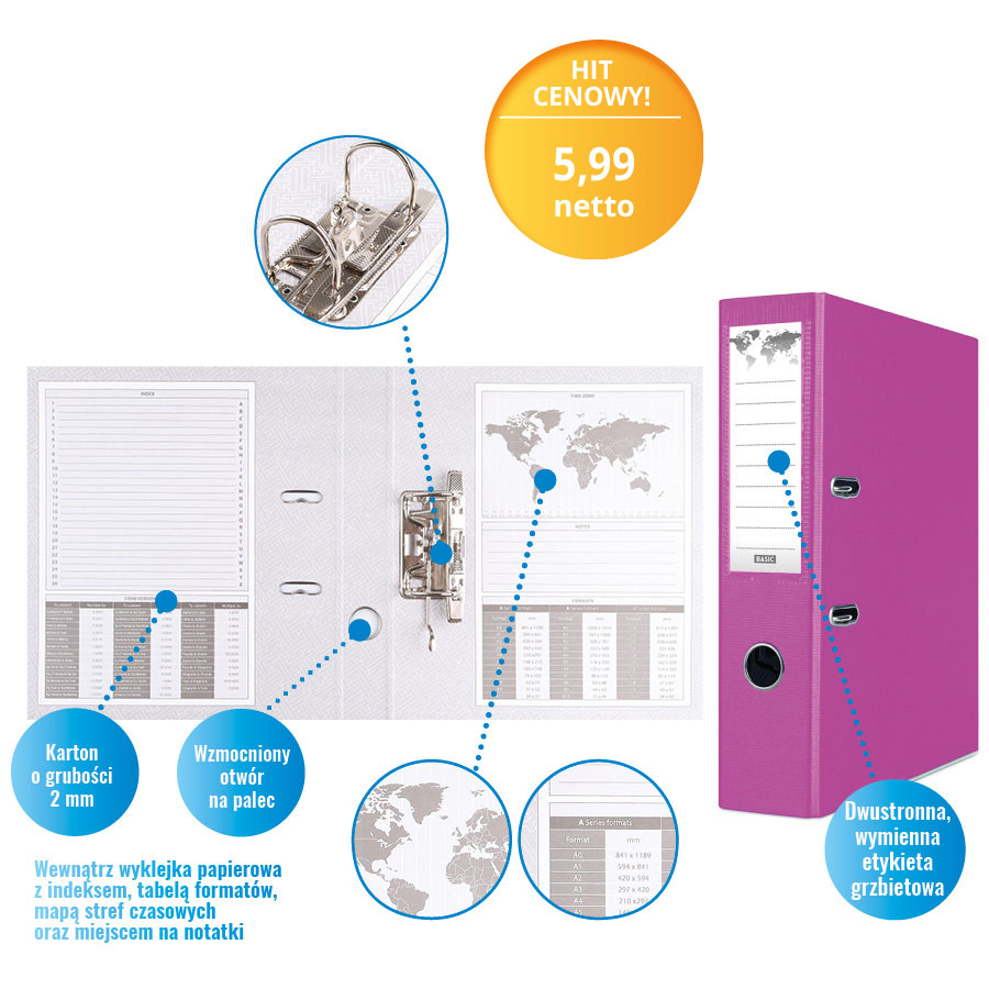 Ekonomiczny i praktyczny segregator to doskonałe rozwiązanie do przechowywania i porządkowania dokumentów w biurze oraz w domu. Wykonany z trwałego kartonu o grubości 2 mm, pokrytego jednostronnie matową folią PP, zapewnia długą żywotność i odporność na uszkodzenia.