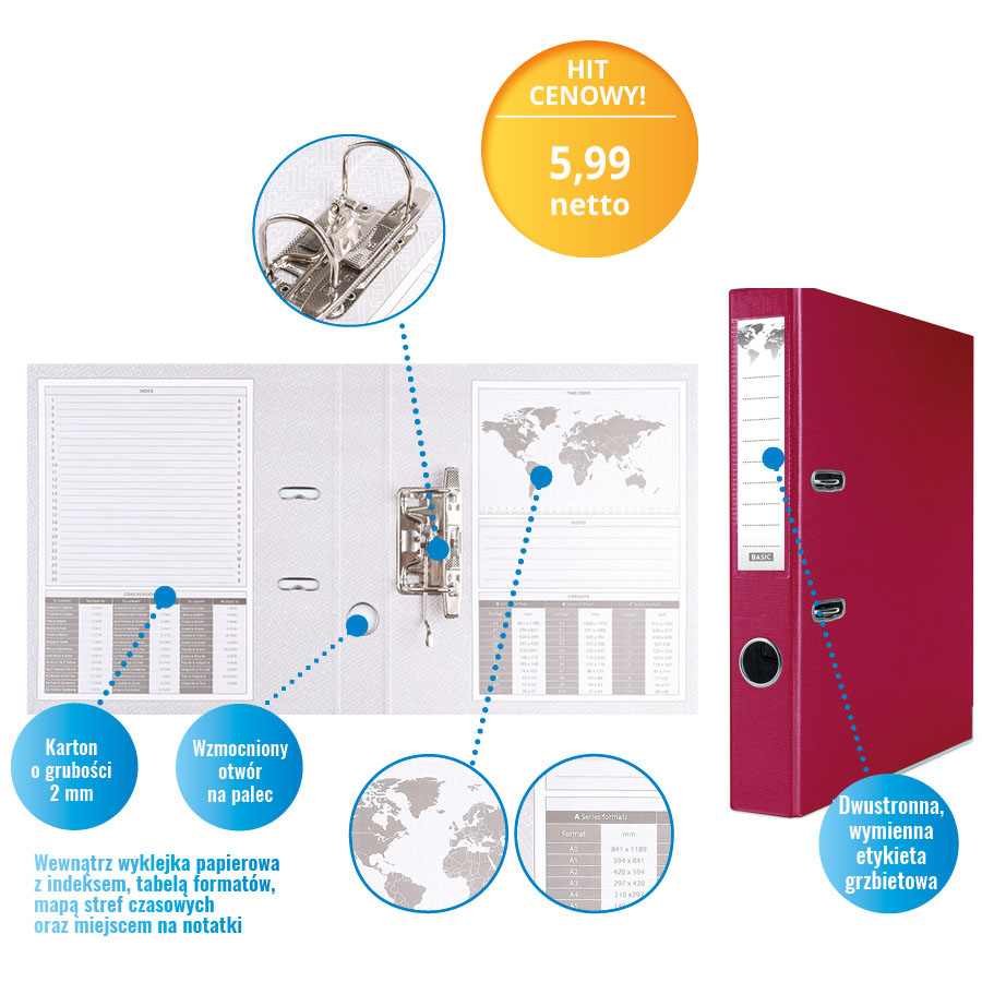 Wewnątrz znajduje się papierowa wyklejka z przydatnymi informacjami, takimi jak indeks, tabela formatów, mapa stref czasowych oraz miejsce na notatki. Dodatkowe udogodnienia to dolna listwa wzmacniająca, wzmocniony otwór na palec oraz dwustronna, wymienna etykieta grzbietowa, ułatwiająca identyfikację zawartości.