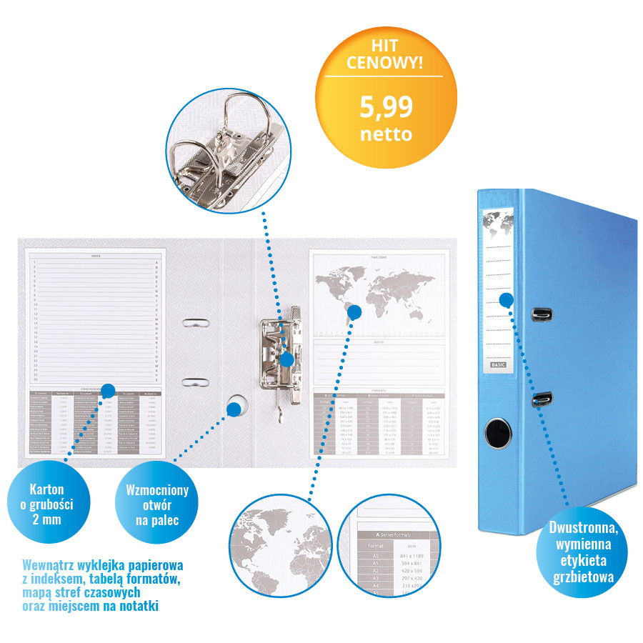 Wewnątrz znajduje się papierowa wyklejka z przydatnymi informacjami, takimi jak indeks, tabela formatów, mapa stref czasowych oraz miejsce na notatki. Dodatkowe udogodnienia to dolna listwa wzmacniająca, wzmocniony otwór na palec oraz dwustronna, wymienna etykieta grzbietowa, ułatwiająca identyfikację zawartości.