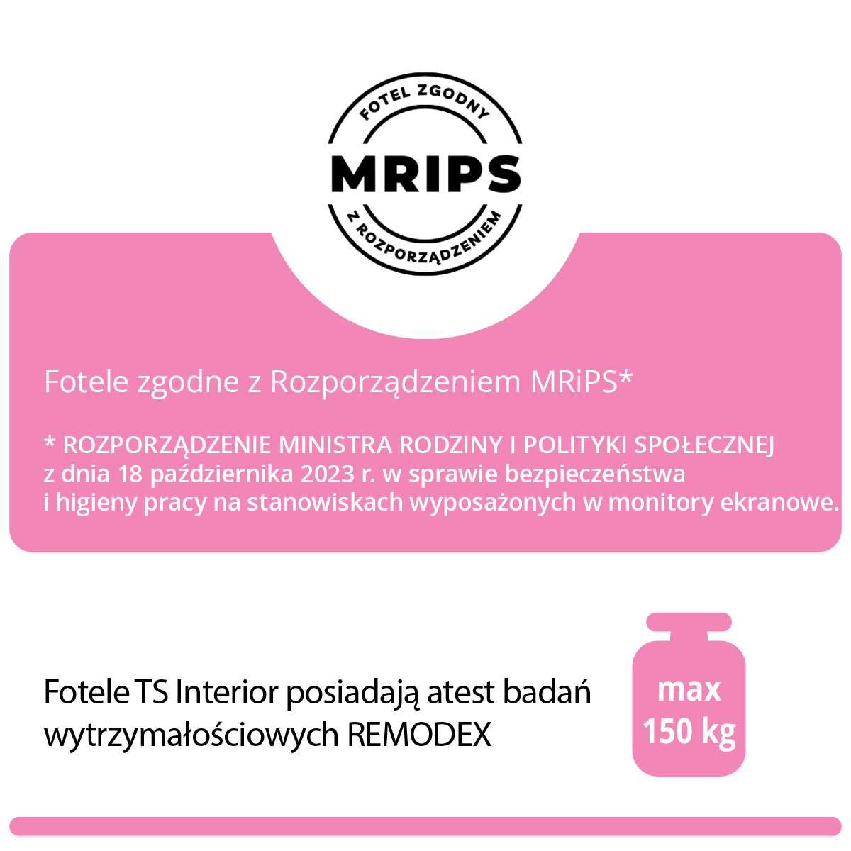 Fotel spełnia wymagania Rozporządzenia MRiPS, co czyni go idealnym wyborem dla osób dbających o ergonomię miejsca pracy oraz komfort podczas codziennych obowiązków.