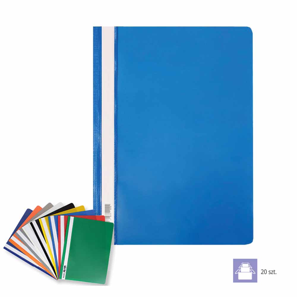 Skoroszyt wyposażony jest w wymienny, papierowy pasek do opisu, który ułatwia identyfikację zawartości. Dwa wycięcia umożliwiają szybkie i łatwe wysuwanie paska, co dodatkowo poprawia funkcjonalność. Zaokrąglone rogi obu okładek zwiększają komfort użytkowania i zapobiegają uszkodzeniom innych dokumentów.